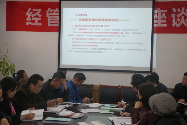 3月12日下午,在学院会议室朱铁壁院长带头学习解读了《国家职业教育改革实施方案》(职教20条),首先朱院长带领全体教职工学习了文件的主要内容,其次,朱院长从坚持问题导向,实现三个转变,从“借鉴”到“创造”的转身,扎根中国大地办职业教育等方面谈了自己的学习体会,最后朱院长结合学院实际情况,阐释了2019年的发展思路和工作重点,号召全院教职工统一思想,凝聚共识,学思践悟,创先争优,沉下心来做好自己的事情,积极处理好守正和创新的关系。