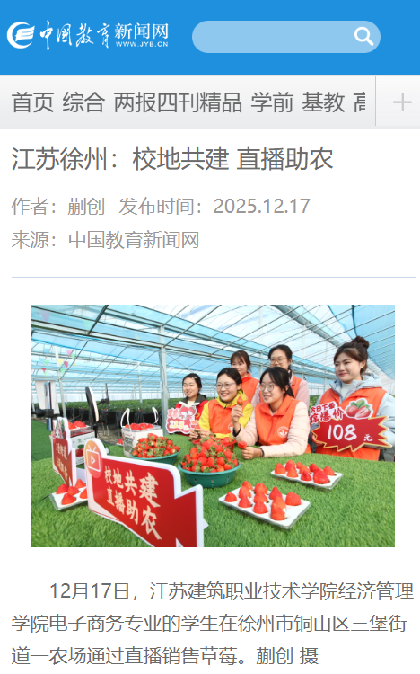 12月17日,我院电子商务专业学生走进徐州市铜山区三堡街道农场,通过现场直播的方式,助力当地草莓销售。这场生动鲜活的社会实践,是我院团委与铜山区三堡街道团工委持续深化“校地共建”合作、协同育人与服务地方发展的又一实际举措。